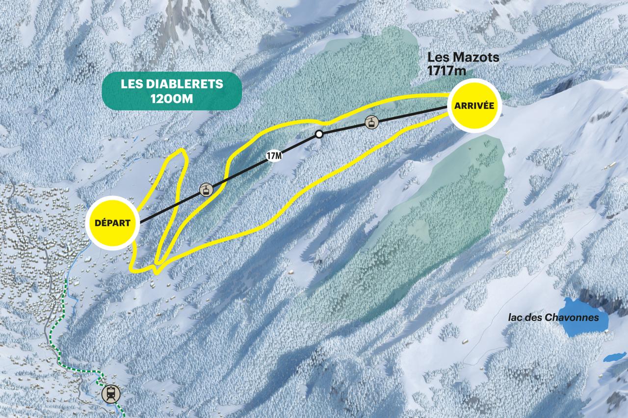 Au départ de la télécabine Diablerets Express aux Diablerets (1165m) deux variantes sont offertes aux randonneurs. La piste de la Jorasse s’élève rapidement dans la forêt pour rejoindre les Mazots (1715m) tandis qu’un autre itinéraire emprunte la piste de luge qui remonte doucement le long de la route du Col de la Croix jusqu’aux Mazots en 6.5km. La descente s’effectue sur la piste de la Jorasse uniquement. Il n’est pas possible de poursuivre au-delà des Mazots, en raison du damage en cours.